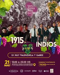 En primer lugar «1915», la banda bonaerense liderada por Cruz Hunkeler, con un sonido fresco que combina pop y rock e influencias progresivas. Por otro lado, se podrá disfrutar de «Indios», grupo rosarino que bajo el mando de Joaquín Vitola que llevará lo mejor del rock-pop alternativo, con melodías y letras muy pegadizas. Estos dos shows imperdibles se llevarán a cabo durante la tarde con el inigualable entorno de los viñedos.
