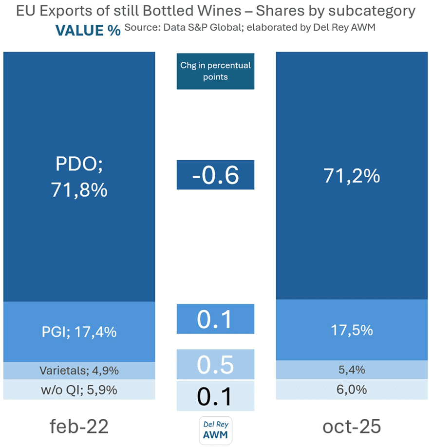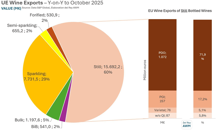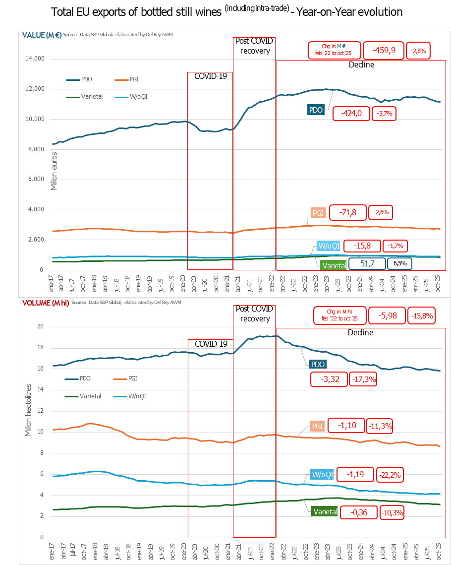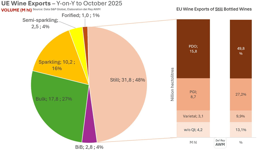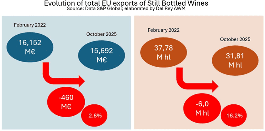 Los vinos tranquilos embotellados han desempeñado un papel central en la marcada caída del volumen de las exportaciones de vino de los países de la Unión Europea desde comienzos de 2022. Durante el período que abarca los 12 meses hasta octubre de 2025, las exportaciones totales de vino de la UE disminuyeron un 11,9%. Dentro de esta caída general, los vinos tranquilos embotellados registraron un descenso aún mayor, del 15,8%.