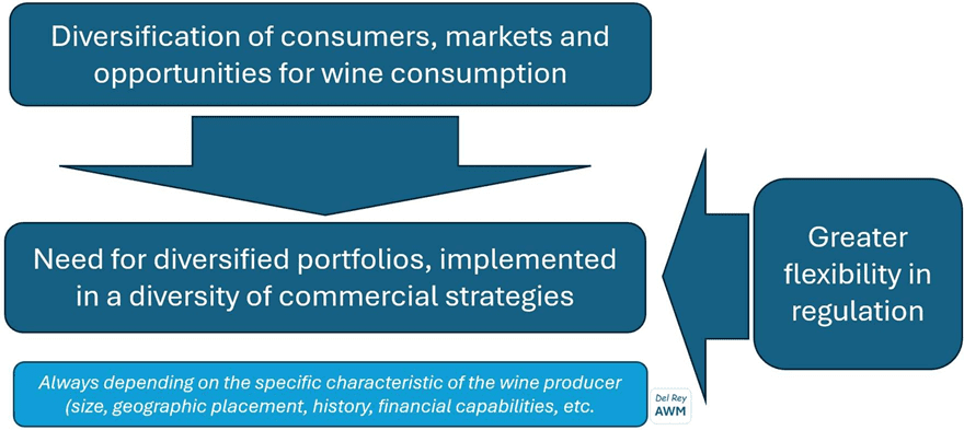 Tradicionalmente, la estrategia del sector vitivinícola de la UE ha favorecido a los vinos DOP —que representan la mayoría de las exportaciones de vinos tranquilos embotellados— mediante legislación y subvenciones. Sin embargo, los recientes desarrollos del mercado apuntan a una creciente diversificación entre consumidores, hábitos de consumo y productos, a lo largo de distintos segmentos de precios y mercados geográficos.