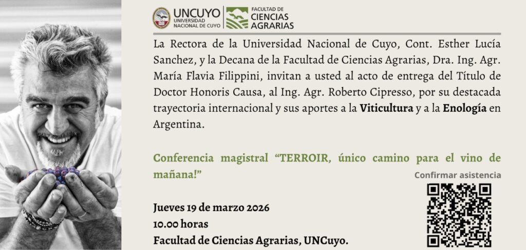 Este jueves 19 de marzo a las 10 hs. la Facultad de Ciencias Agrarias de la Universidad Nacional de Cuyo, hará entrega de la distinción de Doctor Honoris Causa al enólogo italiano Roberto Cipresso, quien además dictará la Conferencia Magistral “El terroir como único camino para el viñedo del mañana”. Este reconocimiento es una validación científica de una visión que ha cambiado radicalmente la viticultura sudamericana, elevando el vino de producto agrícola a narración geológica e histórica.
