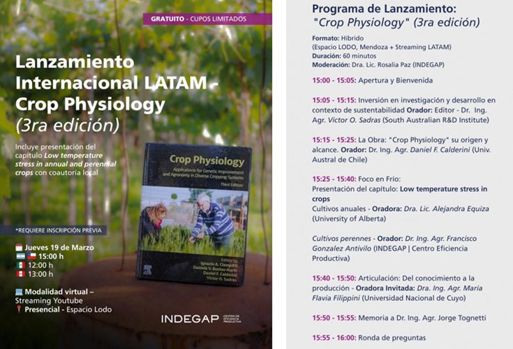 El próximo jueves 19 de marzo a las 15 hs se llevará a cabo la presentación oficial para Latinoamérica de la tercera edición de Crop Physiology, una de las publicaciones más reconocidas a nivel mundial en fisiología vegetal. El evento se desarrollará en modalidad híbrida: presencial en el Espacio Lodo (Lateral Este, Acceso Sur 5291, Luján de Cuyo, Mendoza) y con transmisión virtual para toda Latinoamérica. Los cupos presenciales son limitados.