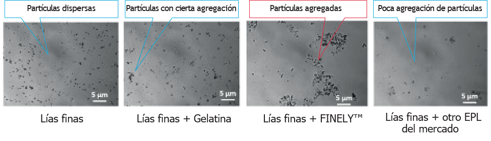 A diferencia de la gelatina y otros supuestos extractos proteicos de levadura del mercado, FINELY™ atrapa partículas incluso en ausencia de taninos, mejorando la sedimentación. La figura 2 muestra imágenes obtenidas por microscopía óptica del sedimento tras un tratamiento de clarificación a escala de laboratorio de una solución modelo de vino que contenía lías finas de vino (pequeños fragmentos de células de levadura procedentes de la autólisis tras la fermentación o partículas coloidales de uva). FINELY™ interactuó directamente con estos coloides, mientras que la gelatina y el «otro EPL del mercado» no lo hicieron, en comparación con el control no tratado («lías finas»).