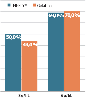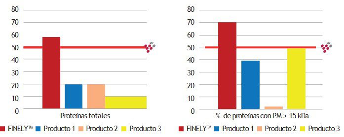 La eliminación de las proteínas formadoras de turbidez en la elaboración del vino blanco o rosado se consigue actualmente mediante la adición de bentonita, un agente clarificante muy utilizado y eficaz, pero que puede provocar pérdidas en la calidad del vino. FINELY™, además de su efecto clarificante, también es eficaz para reducir el riesgo de turbidez por las proteínas termoinestables del vino, ayudando así a conseguir la estabilidad de las proteínas con una menor adición de bentonita.