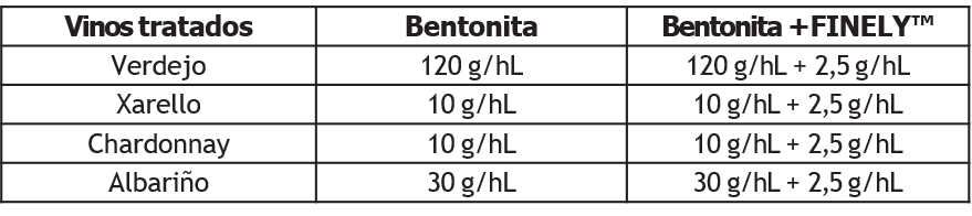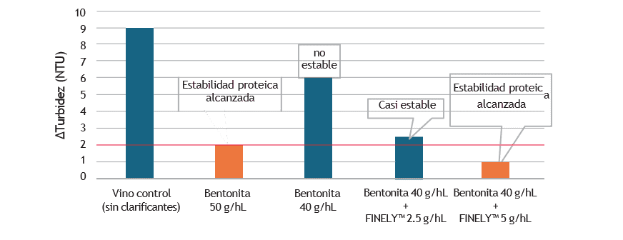 Se añadió bentonita sola (40 g/hL y 50 g/hL) y bentonita (40 g/hL) en combinación con FINELY™ a 2,5 g/hL y 5 g/hL a un vino Godello (Galicia, España). Tras sedimentar durante 6 días a 8 °C, las muestras de vino se sometieron a la prueba de estabilidad proteica por calor, en la que diferencias de turbidez inferiores a 2 NTU antes y después del calentamiento indicaban que el vino había alcanzado la estabilidad proteica.