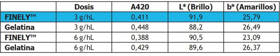 Como se muestra en la Figura 3, el uso de 3 g/hL de FINELY™ produjo un 50% de mosto clarificado, frente al 44% de gelatina. Asimismo, la calidad del mosto clarificado obtenido fue superior utilizando FINELY™ a ambas dosis, indicado por un menor pardeamiento del color en los mostos (menor A420 y b*) y más brillo (Tabla 1). Además, se calculó la diferencia de color CIELab, ΔE*, entre el color medido de los mostos. Para la dosis de 3 g/hL, se obtuvo una ΔE = 3,77, y para la dosis de 6 g/hL, una ΔE = 3,41. En ambos casos, estos valores fueron superiores a los umbrales de discriminación del color en vinos blancos para el ser humano (ΔE>2,5), lo que indica que la mejora del color por FINELY™ es perceptible para el ojo humano.