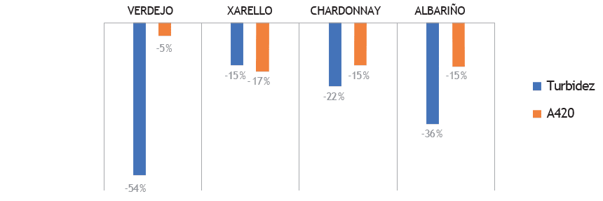 En la Figura 4, se observa cómo, al añadir 2,5 g/hL FINELY™ y mantener la misma dosis de bentonita, la reducción de la turbidez es mucho más eficiente (del 15 al 54%), así como la mejora del color de los vinos (disminución de A420 nm del 5% al 17%) que al utilizar únicamente bentonita a la misma dosis.