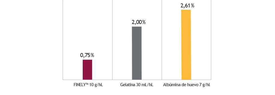 Entre otros parámetros, se determinó el nivel de compacidad de las lías mediante la cantidad de residuos dejados por cada agente clarificante. Los resultados mostraron que FINELY™ además de conseguir una importante mejora sensorial del vino a través de la eliminación de la sensación de tanicidad secante, produjo el menor porcentaje de lías en relación a la dosis utilizada (Figura 6), lo que significa una mejor compactación de las lías y una menor pérdida de volumen del vino.
