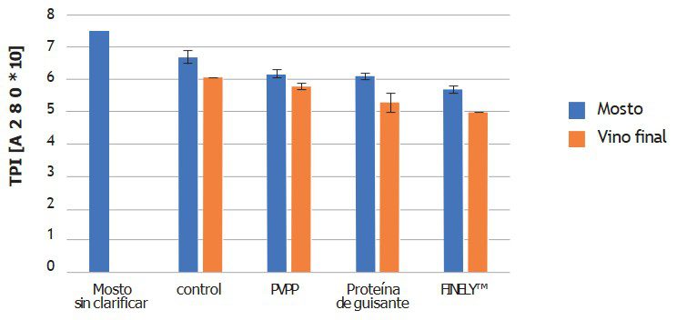 El mosto sin clarificar presentaba el valor de IPT más elevado. Tras la clarificación, se observó una disminución del IPT (Figura 8). La mayor reducción del IPT se observó en los mostos tratados con FINELY™ (~23%), seguidos de la proteína de guisante (~19%), el PVPP (~16%) y la muestra de control (~ 11%). La reducción de IPT fue aún mayor tras la fermentación alcohólica, alcanzando ~ 33% en los mostos tratados con FINELY™, seguido de la proteína de guisante (~29%), PVPP (~22%) y la muestra de control (~18%).