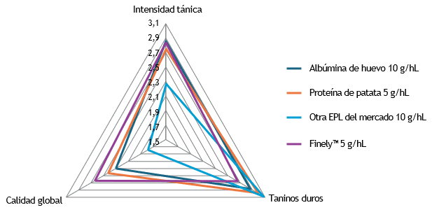 La clarificación de vinos tintos con FINELY™ se conoce como una clarificación respetuosa. Y no sólo reduce la turbidez de los vinos tintos, sino que también confiere mejores características sensoriales debido a su gran afinidad para eliminar los taninos agresivos responsables del amargor y la astringencia, obteniendo así vinos tintos más redondos y sedosos (Figura 7).