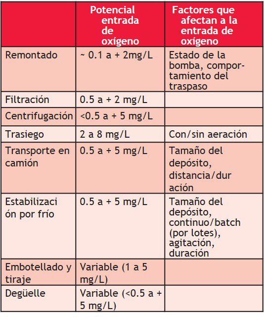 Una vez finalizadas las fermentaciones, y antes del embotellado, el vino es vulnerable a la oxidación (Tabla 1). La entrada de oxígeno puede variar desde 0,1 mg/L a 8 mg/L dependiendo de la operación. Se recurre al SO2 para proteger al vino o a la desoxigenación física para eliminar cualquier exceso de oxígeno.