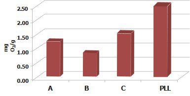 Uno de ellos mostró la mayor capacidad de consumo de oxígeno con 1 mg/L de oxígeno disuelto y una tasa de 0,74 mg O2/h al añadirlo al vino modelo con una concentración de 20 g/hL como muestra la Figura 1. Esta alta tasa de consumo puede proteger al vino de la oxidación durante las diferentes etapas desde el proceso de posfermentación hasta el embotellado.
