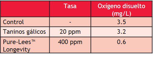 El vino se mantuvo a -4°C durante 5 días con agitación y se comparó el control con la adición de Pure-Lees™ Longevity o bien con su tratamiento habitual, taninos gálicos. El nivel inicia de oxígeno disuelto era de 3,5 m/L y en los depósitos tratados los niveles se redujeron a 3,2 y 0,6 mg/L con los taninos gálicos y Pure-Lees™ Longevity respectivamente (Tabla 2). El Chardonnay australiano reveló un OD mucho más bajo en el vino tratado con Pure-Lees™ Longevity (Tabla 2).
