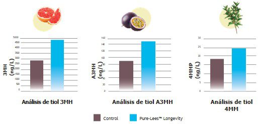 Su acetato, A3MH (fruta de la pasión) y tiol 4MMP (boj) también se encuentran en mayor concentración en los vinos. Los tioles son muy sensibles al oxígeno y están mejor protegidos con Pure-Lees™ Longevity. Se observó la misma tendencia con el SO2 (libre y total) y el oxígeno disuelto (Figura 4). Consecuentemente, estos vinos tuvieron una vida útil más larga y un mejor valor de mercado.