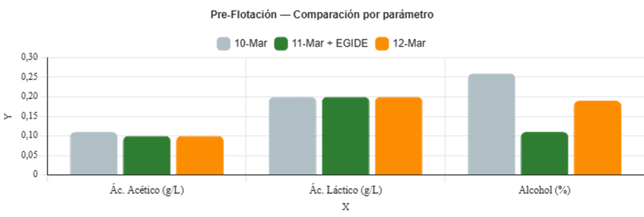 - Comparación 10 vs 11‑Mar con EGIDE: −33% Ác. Acético / −52% Ác. Láctico / −28% Alcohol