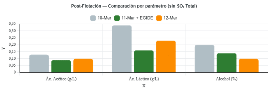 - Tras aplicar EGIDE (11‑Mar): Acético: 0,10 g/L / Láctico: 0,20 g/L / Alcohol: 0,11 %