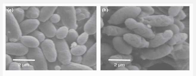 Los resultados obtenidos utilizando la laminarina como sustrato de crecimiento confirmaron lo ya observado mediante microscopía electrónica de barrido: tras 24 horas en presencia del factor de inhibición, las células de Brettanomyces presentaban evidentes signos de degradación de la pared celular, con superficies rugosas, mientras que las no tratadas aparecían lisas y morfológicamente íntegras (Fig. 2) (Mehlomakulu et al., 2017).