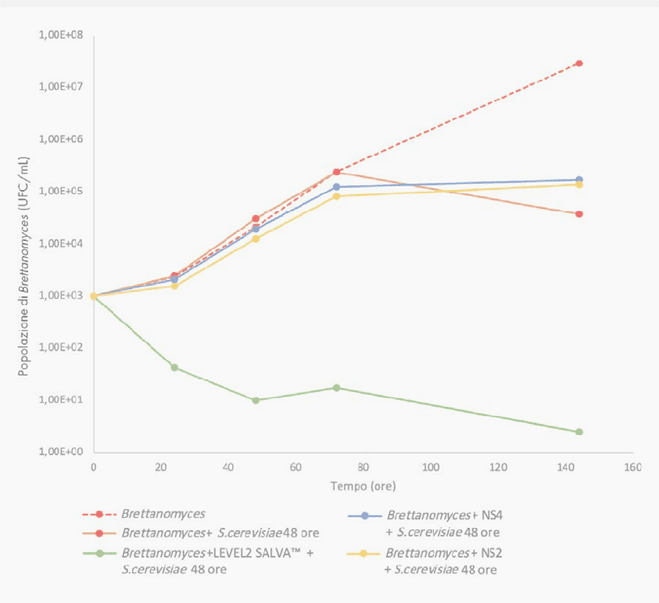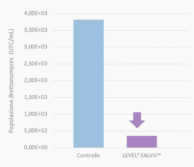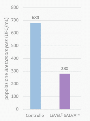 Numerosos ensayos experimentales y de laboratorio se han llevado a cabo para evaluar la eficacia del uso de LEVEL2 SALVA™ en condiciones enológicas. En una prueba realizada en los laboratorios de Lallemand Oenology, la eficacia y especificidad de LEVEL2 SALVA™ para contrarrestar Brettanomyces bruxellensis se evaluaron mediante una comparación directa con otras dos cepas no-Saccharomyces disponibles en el mercado (NS2 y NS4), ambas conocidas por sus propiedades de bioprotección, así como con una cepa de Saccharomyces de referencia.