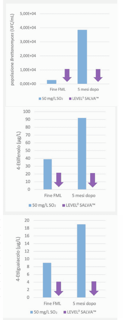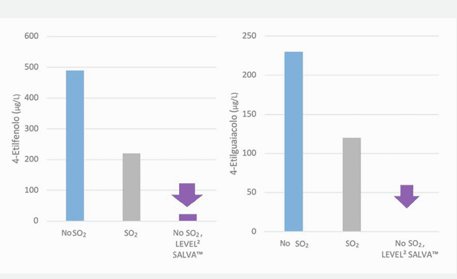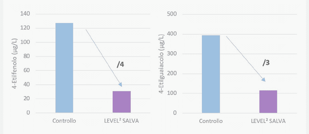 Todo el mosto fue contaminado con Brettanomyces a 1×10³ UFC/mL; una modalidad de control fue inoculada directamente con S. cerevisiae y la otra con LEVEL2 SALVA™, seguida, tras 48 horas, de la inoculación con S. cerevisiae. Al final de la fermentación alcohólica, los fenoles volátiles presentaron concentraciones significativamente inferiores en las muestras tratadas con LEVEL2 SALVA™ en comparación con el control (Fig. 5).