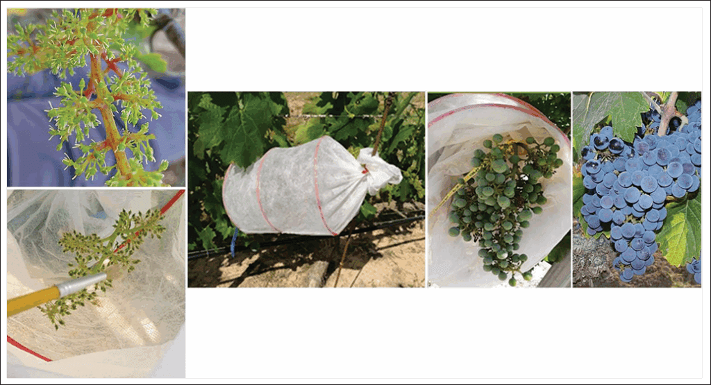 Una vez seleccionada la variedad madre de los cruzamientos, se emasculan sus racimos, eliminando con unas pinzas pequeñas los estambres de la inflorescencia sin dañar el pistilo ni el estigma (Figura 2). El momento adecuado de la emasculación es el inicio de la floración, cuando se observan una o dos flores abiertas en el racimo, que serán eliminadas para evitar autofecundaciones. Los racimos emasculados deben protegerse con una bolsa para impedir que se polinicen con variedades próximas en floración.