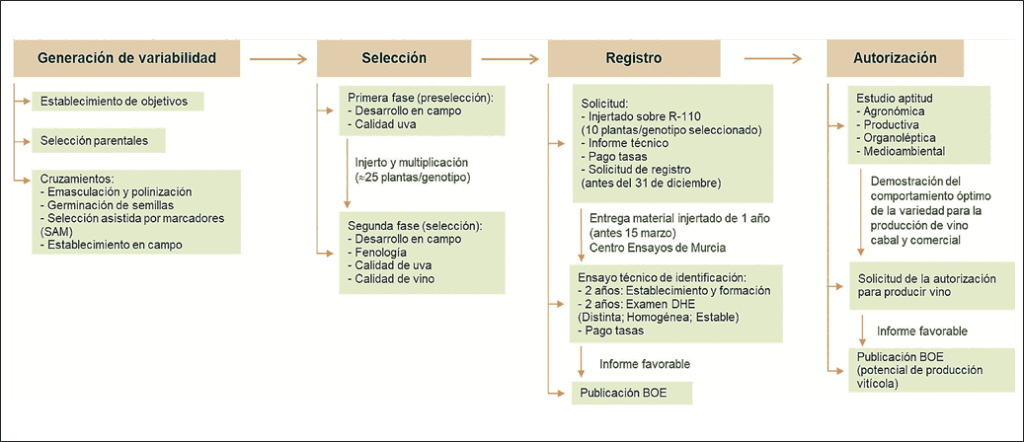 La finalidad de la mejora genética vegetal es optimizar las características de las variedades disponibles, ya sea mediante métodos convencionales, como los cruzamientos dirigidos, o mediante métodos biotecnológicos. Todos los métodos tienen dos etapas en común: generar variabilidad genética y seleccionar los mejores individuos obtenidos. En este trabajo se describen los pasos técnicos y administrativos implicados en la mejora genética de uva de vinificación mediante cruzamientos dirigidos (Figura 1), desde la experiencia del Instituto Murciano de Investigación y Desarrollo Agrario y Medioambiental (IMIDA).