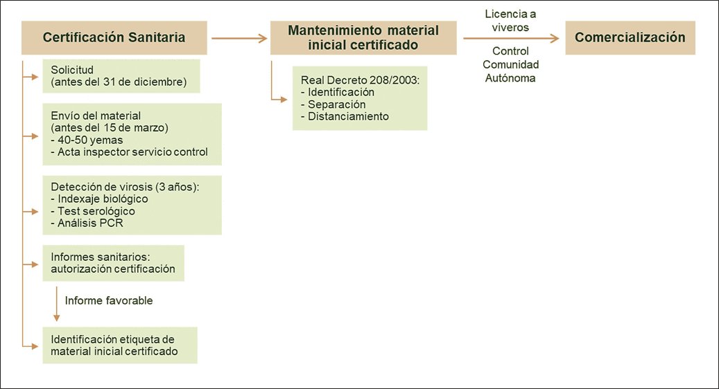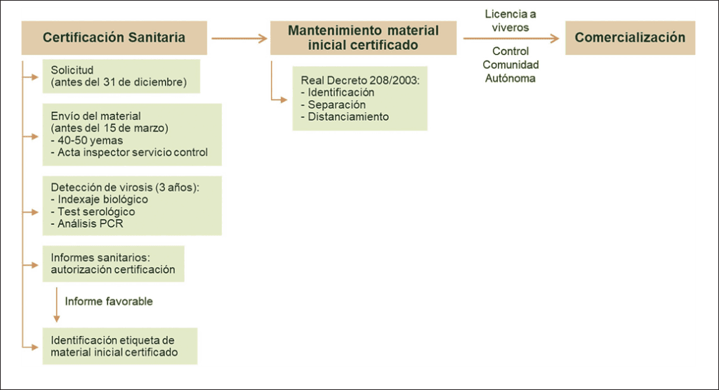 En paralelo, se recomienda solicitar la certificación sanitaria del material inicial (Figura 3), a través del programa financiado por el MAPA y ejecutado por el IMIDA. El diagnóstico y detección de virosis se realiza durante tres años mediante indexaje biológico, test serológico (ELISA) y análisis molecular por PCR. Los resultados obtenidos se envían a la OEVV, que autorizará a las distintas CCAA para su certificación clonal, si procede.