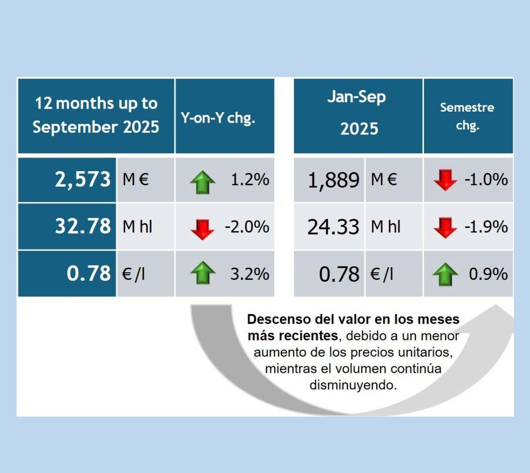 Al comparar las cifras interanuales (12 meses) con los datos más recientes YTD (9 meses, de enero a septiembre), los precios medios parecen moderar su crecimiento, lo que provoca que el valor esté ahora en descenso, impulsado por una caída similar en el volumen (-1,9 % en 9 meses frente a -2,0 % en 12 meses).