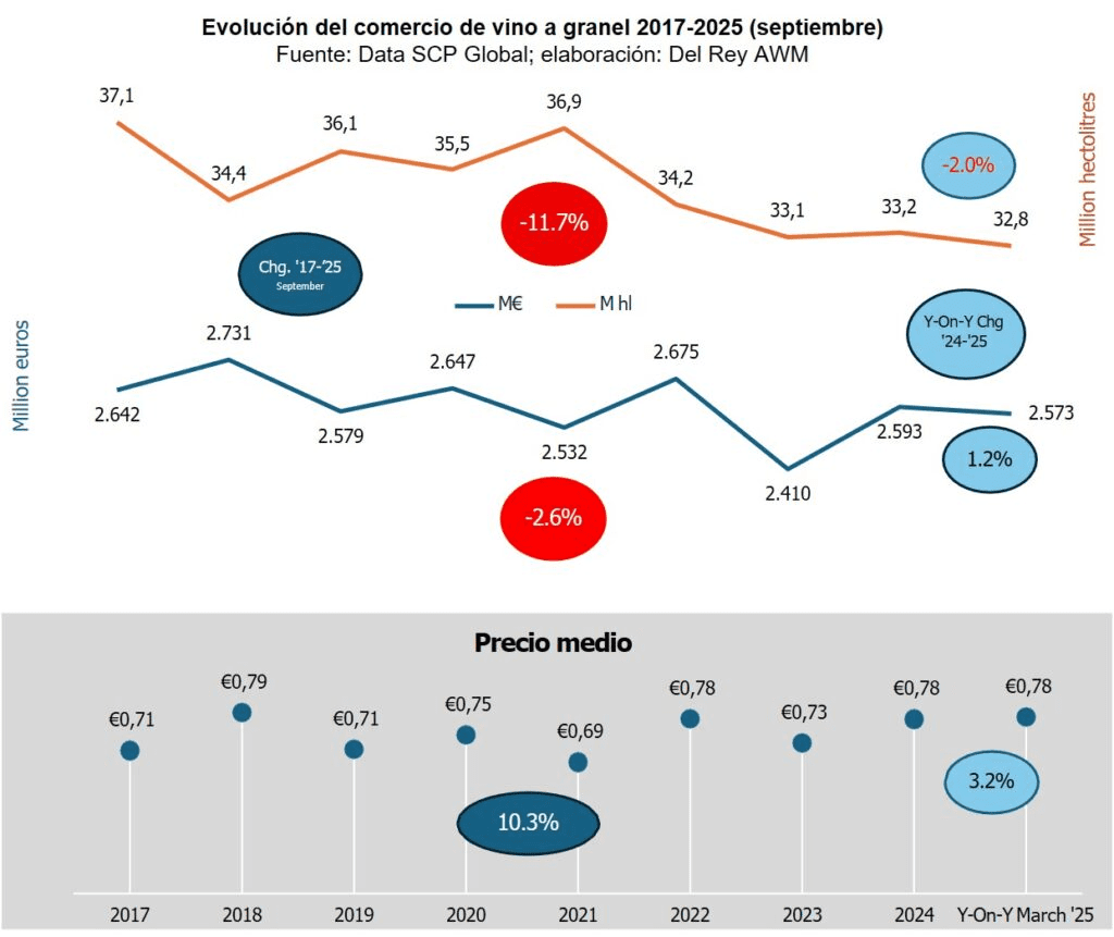 Según un informe de Vinexposium, el comercio mundial de vino a granel representa un tercio del volumen total (33,7 %), aunque solo el 7% del valor total, debido a precios unitarios muy inferiores a la media. En el período de 12 meses hasta septiembre de 2025, alcanzaron 32,78 millones de hectolitros, por un valor de 2.570 millones de euros, con un precio medio de 0,78 euros por litro.