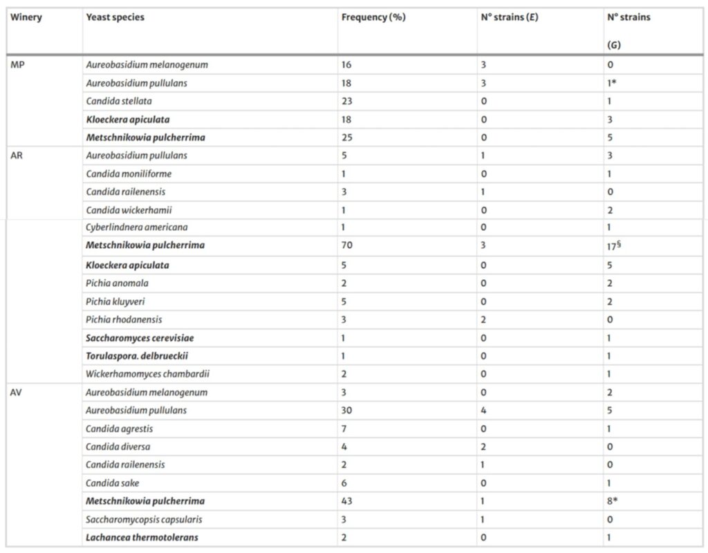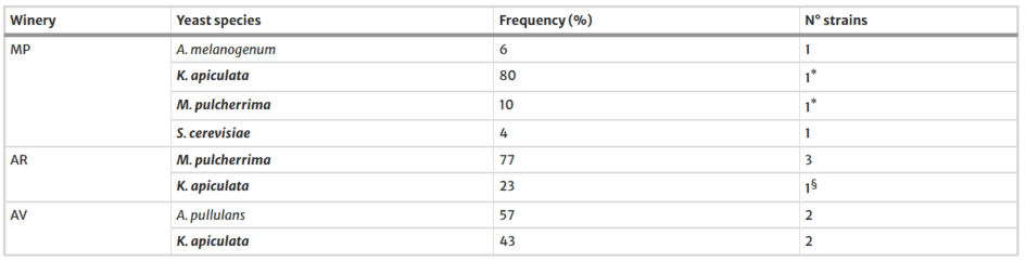 En cuanto a la cuantificación y composición de las poblaciones de levaduras en las bayas de uva en el momento de la cosecha, los resultados coinciden con los de varios estudios previos. Las comunidades de levaduras estaban compuestas principalmente por K. apiculata, A. pullulans y M. pulcherrima, mientras que S. cerevisiae se confirmó ausente o muy poco frecuente en uvas sanas.