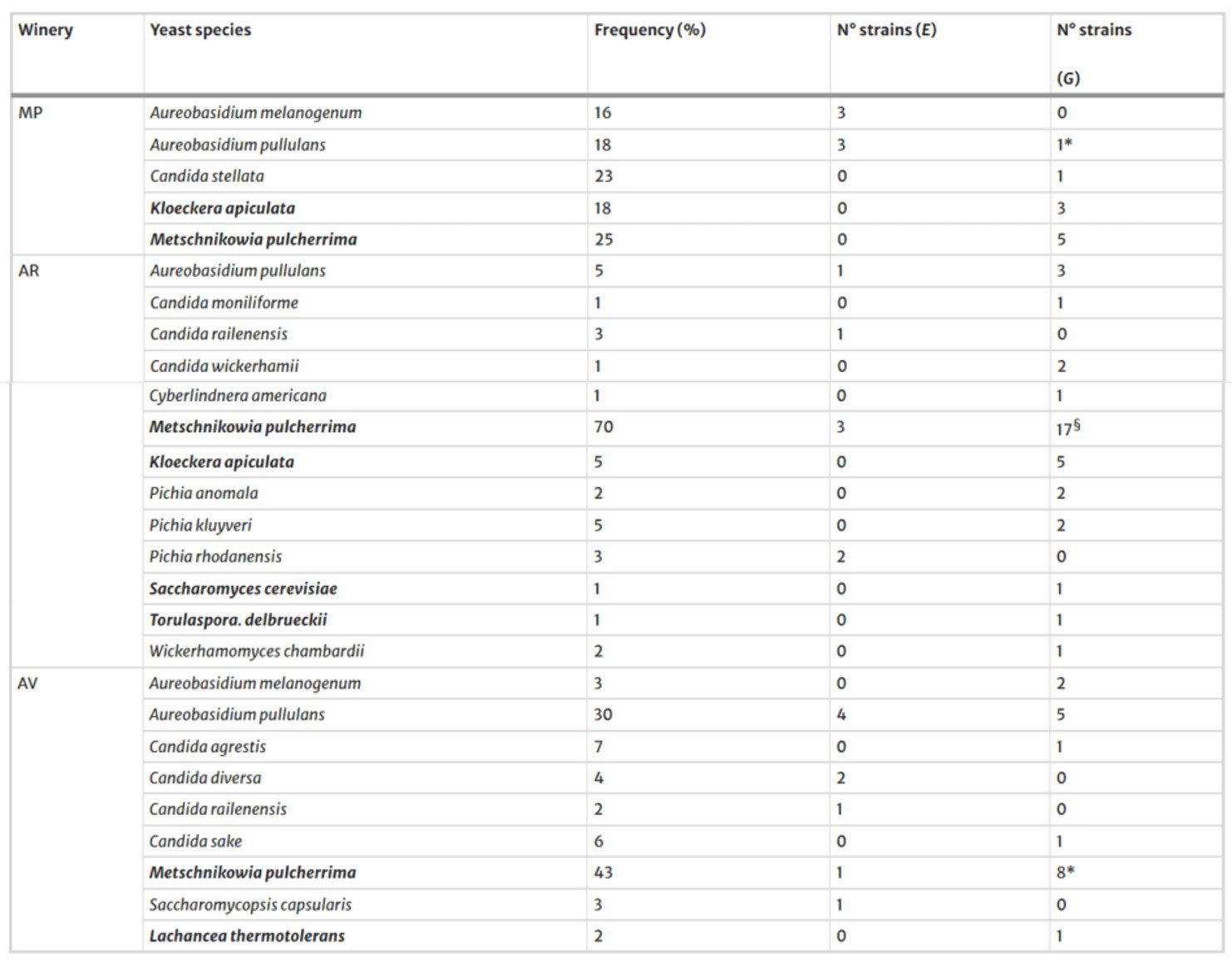 Metschnikowia pulcherrima fue la especie de levadura asociada con las avispas en mayor porcentaje, independientemente del viñedo de origen. Además, también fue la especie de levadura predominante en las uvas de las bodegas AR y AV.