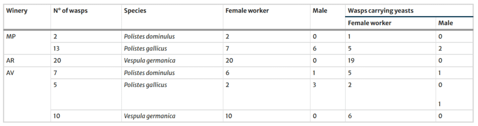 La identificación de levaduras mostró que el hongo levaduriforme Aureobasidium pullulans y la levadura Metschnikowia pulcherrima fueron aislados de avispas capturadas en los viñedos de todas las bodegas y aparecieron con altas frecuencias. Estas especies también han sido encontradas en otros estudios en el intestino de avispas sociales.