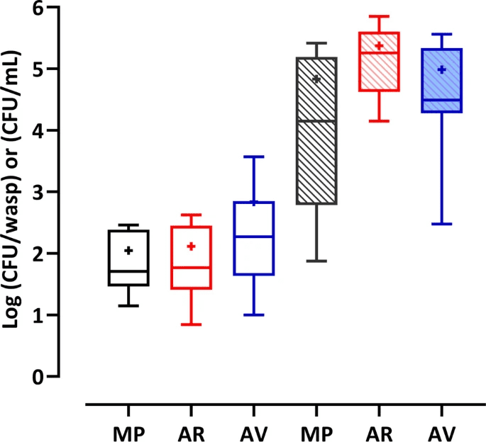 La cuantificación de las poblaciones de levaduras asociadas a las avispas mostró que las concentraciones celulares fueron mayores en el intestino que en el exoesqueleto, independientemente de la especie de avispa y del viñedo de origen. Estos resultados confirman que el intestino de las avispas sociales alberga levaduras capaces de sobrevivir durante el invierno y reproducirse en este ambiente. Además, V. germanica hospedó más células de levadura que las especies de Polistes. Esto probablemente se deba a la capacidad de V. germanica para formar grandes colonias subterráneas, que proporcionan más fuentes microbianas.
