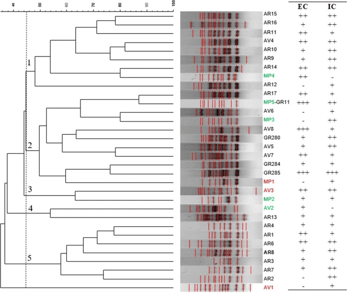 Para evaluar la similitud entre las cepas de M. pulcherrima, todos los diferentes perfiles RAPD-PCR (incluidos los aislados de uvas) se sometieron a un análisis de agrupamiento UPGMA utilizando el coeficiente de Dice. Con un umbral de similitud del 45%, las cepas de M. pulcherrima se agruparon en cinco clústeres distintos (Fig. 2).