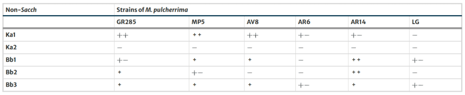 La cepa de M. pulcherrima se consideró sensible si no crecía alrededor de la cepa killer de referencia S. cerevisiae NCYC 738. Las cepas neutras de M. pulcherrima no producían toxina ni eran afectadas por ella.