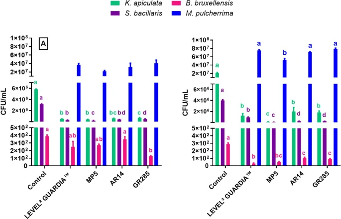 La cepa comercial de M. pulcherrima LEVEL2 GUARDIA™ se utilizó como control. Tres de las cepas seleccionadas de M. pulcherrima (GR285, MP5 y AV8) inhibieron significativamente el crecimiento de la cepa K. apiculata Ka1; las otras dos cepas de M. pulcherrima mostraron actividad moderada, mientras que la cepa comercial no presentó efecto sobre las cepas apiculadas (Tabla 4).