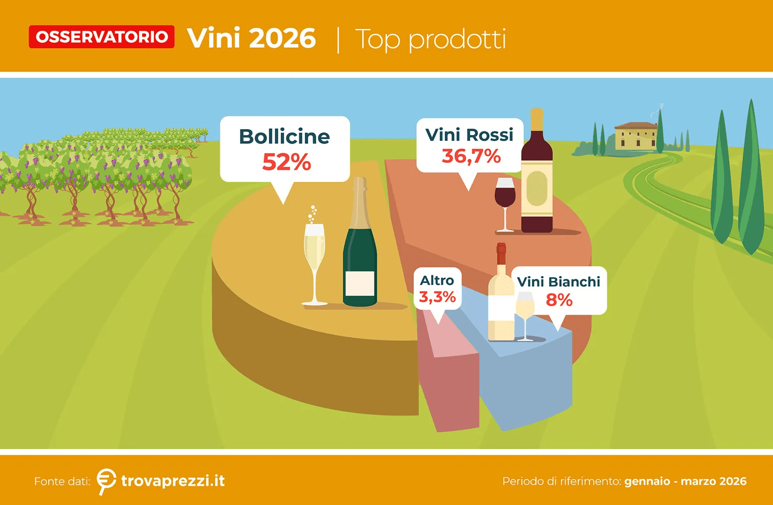 En el marco de la Feria Vinitaly 2026, se difundió un análisis de Trovaprezzi sobre las tendencias, preferencias y dinámicas de compra de los aficionados al vino en el ámbito digital. El informe revela que durante el 1er trimestre e 2026 se superaron las 657.000 busquedas de vino on line en Italia marcando un crecimiento del 10% respecto al mismo período de 2025. Los vinos espumosos dominan el mercado, con un interés cercano al 52% , seguidos por los vinos tintos con un 36,7%.