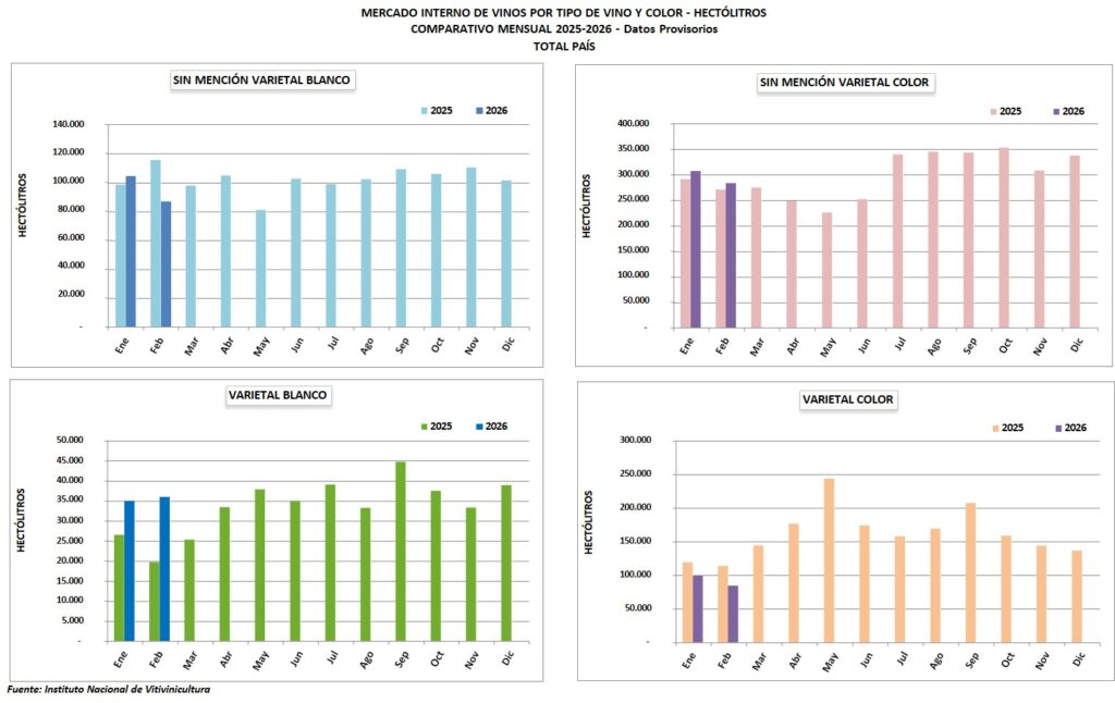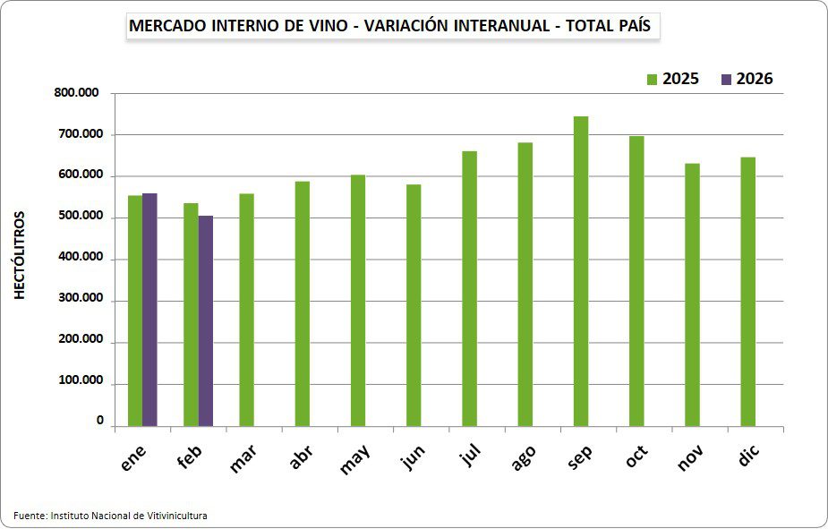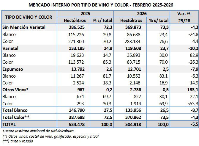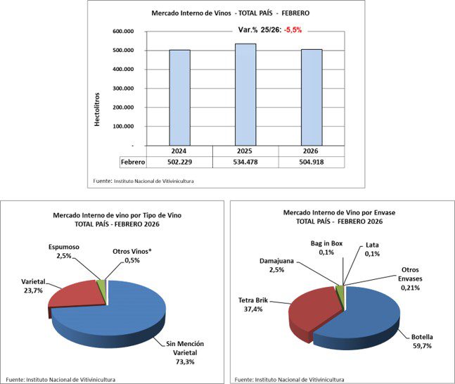 Las ventas de vino en el mercado interno durante el mes de febrero 2026 alcanzaron un volumen de 504.918 hl, observándose una disminución de -5,5% respecto a igual mes del año anterior. El 73,3% de ese volumen son vinos sin mención varietal; 23,7% varietales; 2,5% espumosos y 0,5% otros vinos (cóctel de vino, gasificado, especial y ritual).