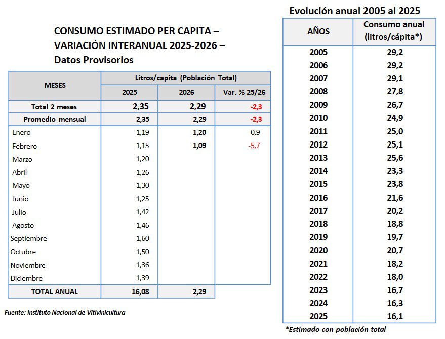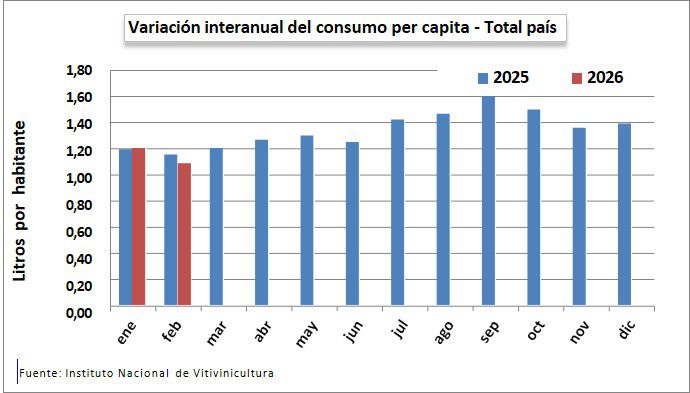 Según el último informe del Instituto Nacional de Vitivinicultura (INV), los despachos de vino al mercado interno argentino en el primer bimestre de 2026 alcanzaron los 1.063.474 hl (-2,2% respecto al mismo período de 2025). En febrero, el consumo per cápita fue de 1,09 lt, acumulando en el año 2,29 lt por habitante (-2,3%).
