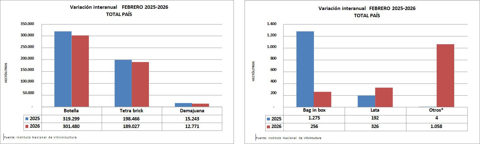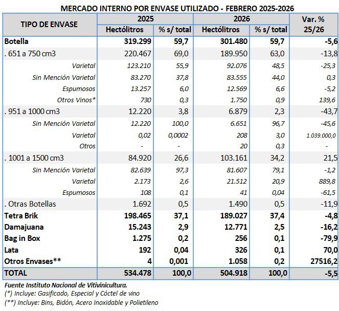 En el interanual febrero 2025/ febrero 2026, disminuyeron los envases botella (-5,6%), tetra brik (-4,8%), damajuana (-16,2%) y bag in box (-79,9%). El envase lata, aumentó +70,0% y otros envases (principalmente bidón) también aumentaron significativamente.