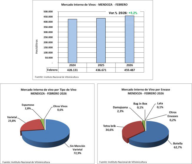 Los despachos de vino al mercado interno desde Mendoza en febrero 2026 fueron de 459.487 hl, lo que evidencia un aumento de +5,2% respecto a igual mes del año anterior.