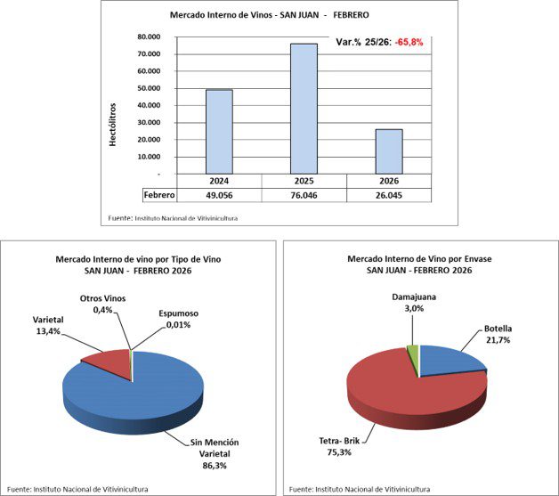 El volumen de vino enviado al mercado interno por San Juan continúa en disminución. Este mes de febrero 2026 se despacharon 26.045 hl, lo que indica una disminución de -65,8% respecto al mismo mes del año anterior.