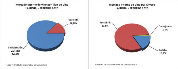 En febrero 2026, La Rioja despachó un 86,0% de vino sin mención varietal y 14,0% de vino varietal. El 81,6% de lo comercializado se despachó en tetra-brik; el 16,9% en botella y 1,5% en damajuana.