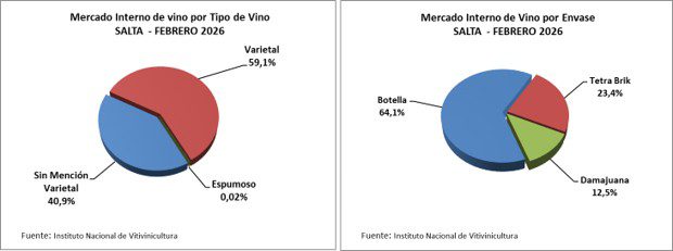 En febrero 2026 Salta despachó el 59,1% del volumen como vino varietal; 40,9% vino sin mención varietal y 0,02% vino espumoso. El 64,1% de los despachos fue en botella; 23,4% en tetra-brik y 12,5% en damajuana.