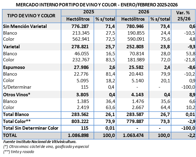 La venta de vino acumulada enero-febrero 2026 alcanzó 1.063.474 hl, manifestando una disminución de -2,2% respecto a igual período del año anterior. La participación de los vinos sin mención varietal es del 73,4%; el 23,8% corresponde a varietales; 2,4% a espumosos y 0,4% a otros vinos (cóctel de vino, gasificado, ritual y especial).