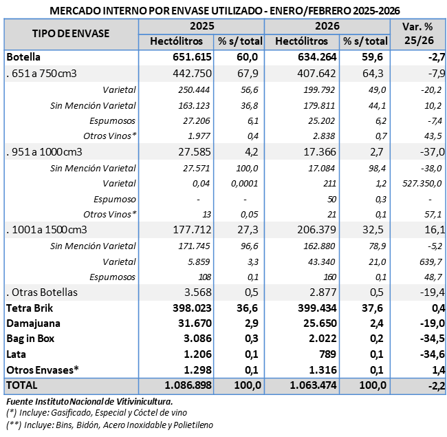 El 62,7% de los vinos despachados por Mendoza en febrero 2026 corresponde a botella, el 34,6% tetra brik; 2,3% damajuana; 0,1% bag in box; 0,1% lata y 0,2% otros envases.