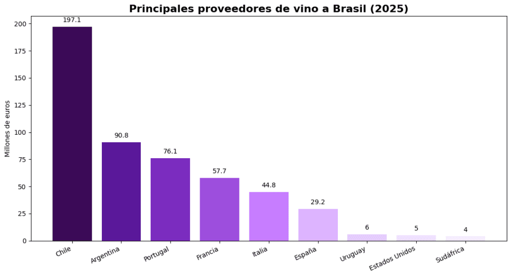 En cuanto a los principales proveedores internacionales de vino para Brasil en valor económico durante el año pasado, Chile ocupó la primera posición con ventas por valor de 197,1 millones de euros (+0,4%), seguido por Argentina con 90,8 millones (-3%). Portugal se situó en tercer lugar con 76,1 millones (-1,4%), Francia con 57,7 millones (+12,2%), Italia con 44,8 millones (+8,3%) y España con 29,2 millones (+13,7%). Les siguen de lejos Uruguay (6 millones), Estados Unidos (5 millones) y Sudáfrica (4 millones).