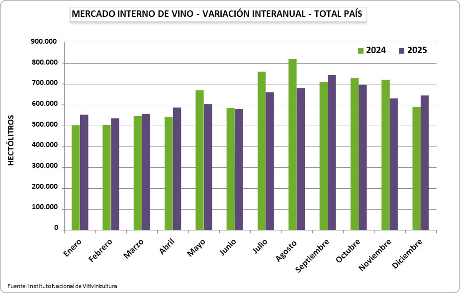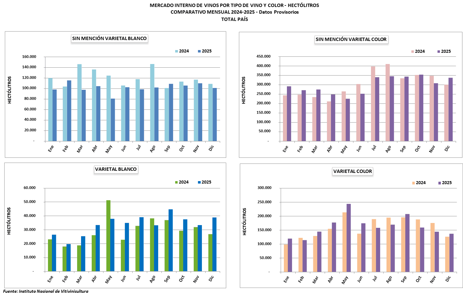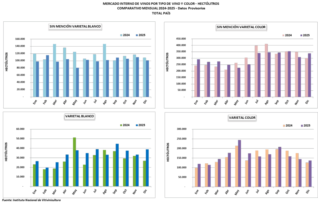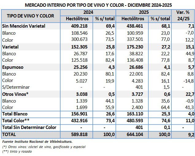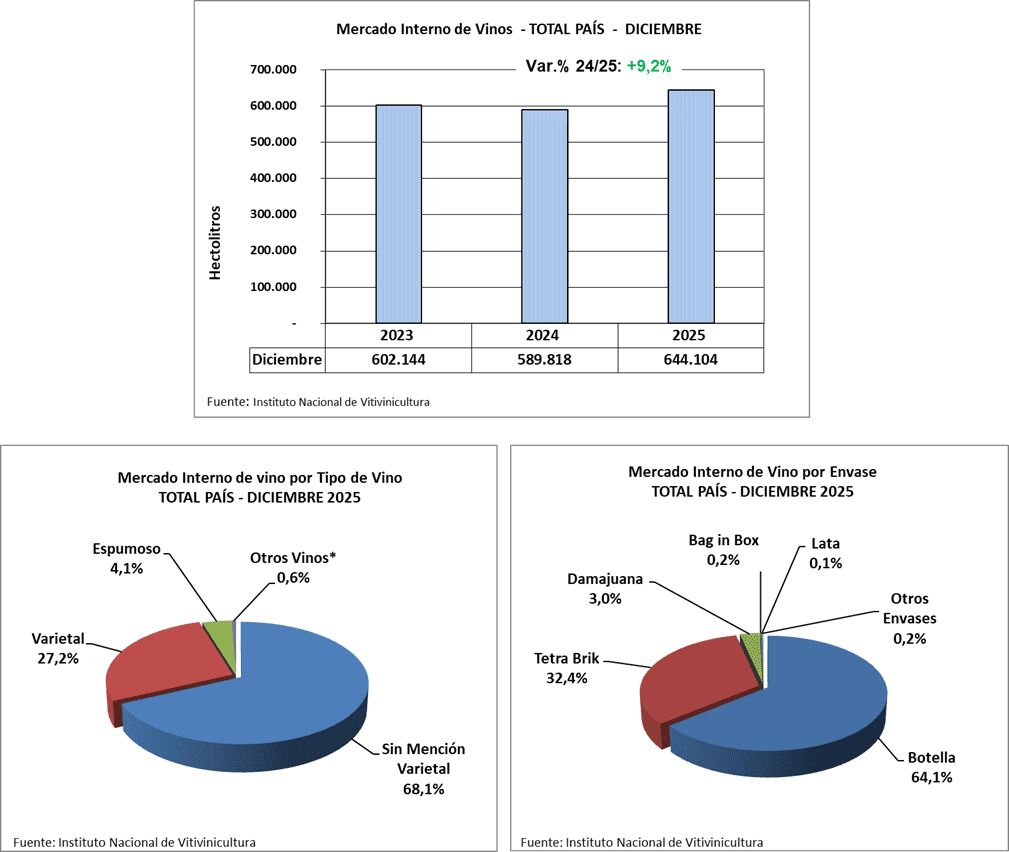 Las ventas de vino en el mercado interno durante el mes de diciembre 2025 alcanzaron un volumen de 644.104 hl, observándose un aumento de +9,2% respecto a igual mes del año anterior. El 68,1% de ese volumen son vinos sin mención varietal; 27,2% varietales; 4,1% espumosos y 0,6% otros vinos (cóctel de vino, gasificado, especial).