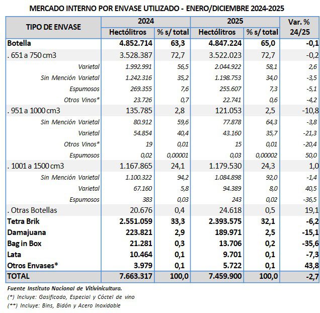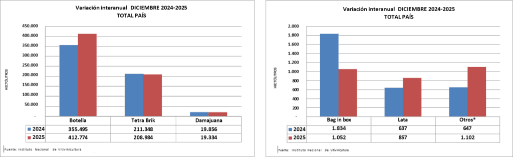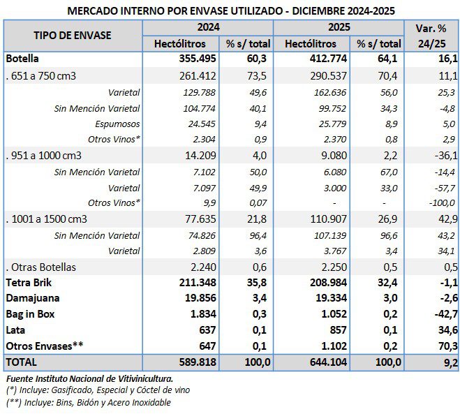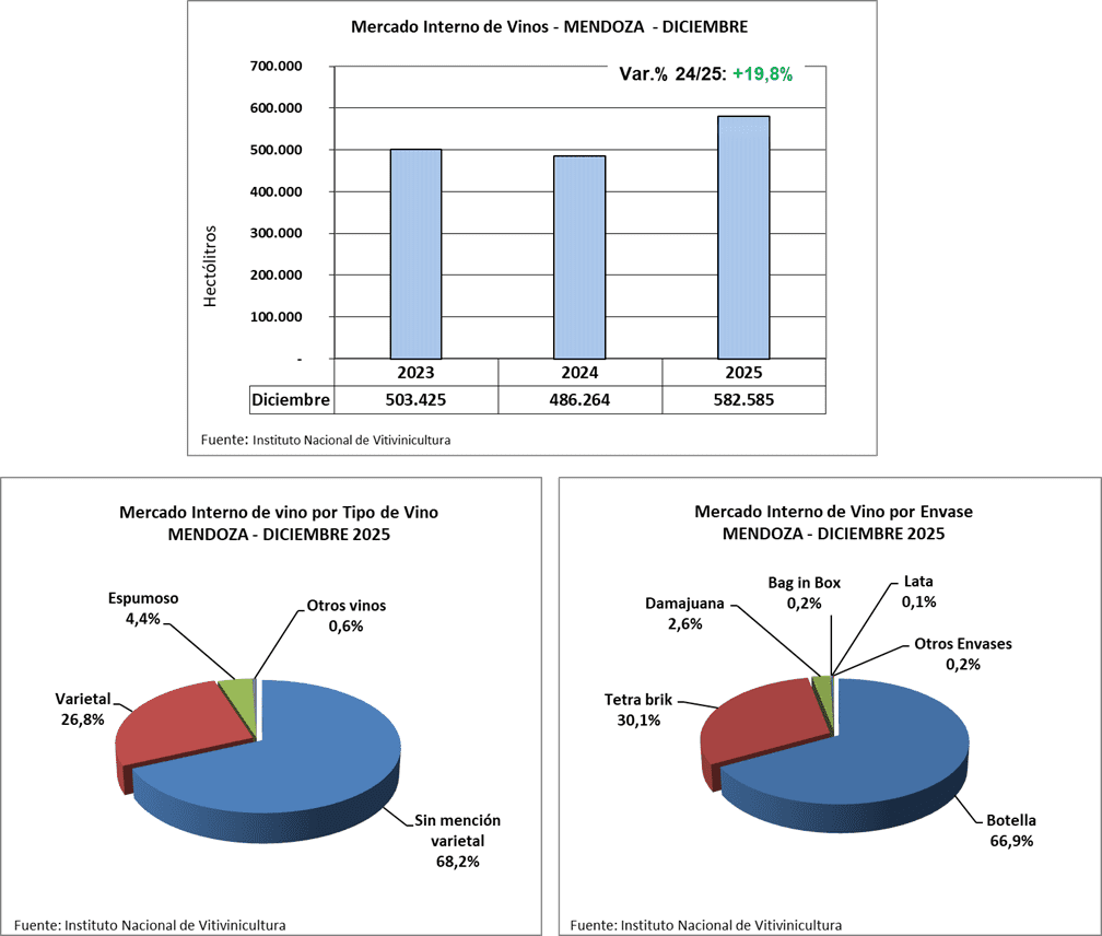 Los despachos de vino al mercado interno desde Mendoza en diciembre 2025 fueron de 582.585 hl, lo que evidencia un aumento de +19,8% respecto a igual mes del año anterior. El 68,2% de los vinos despachados desde Mendoza fue vino sin mención varietal; 26,8% vino varietal; 4,4% vino espumoso y 0,6% otros vinos. Los vinos blancos aumentaron +21,5% y los vinos color +19,2% respecto a diciembre 2024. Los vinos sin mención varietal crecieron +19,1% y varietales +24,9% respecto a diciembre de 2024. El 66,9% de los vinos despachados por Mendoza en diciembre 2025 corresponde a botella, el 30,1% tetra brik; 2,6% damajuana; 0,2% bag in box y 0,1% lata.