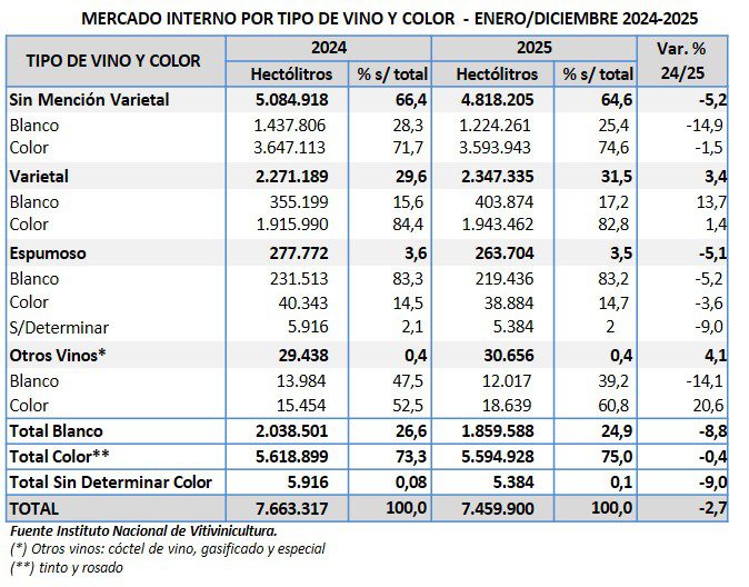 Según el último informe del Instituto Nacional de Vitivinicultura (INV), los despachos de vino al mercado interno argentino en 2025 fueron de 7.459.900 hl (-2,7% respecto a 2024). El consumo per cápita llegó a los 15,77 litros por habitante (-3,2% que en 2024).