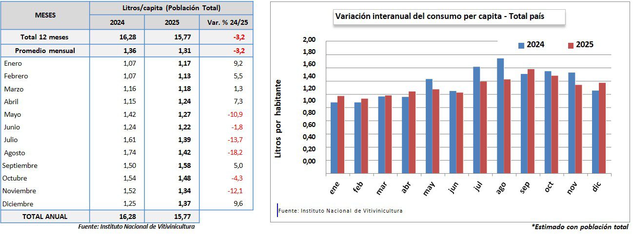 El consumo per cápita del mes de diciembre 2025 arroja un valor de 1,37 litros por habitante (población total país), lo cual indica un aumento de +9,6% respecto a igual mes del año anterior.