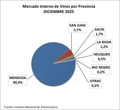 El 90,4% del vino comercializado en diciembre 2025 en el mercado interno se despachó desde Mendoza y el 5,7% desde San Juan. Sigue en importancia Salta (1,7%) y La Rioja (1,2%); luego Neuquén (0,5%) y Rio Negro (0,2%). También despacharon las provincias de Bs As, San Luis, La Pampa, Catamarca, Córdoba, Jujuy, Entre Ríos, Tucumán y Chubut.